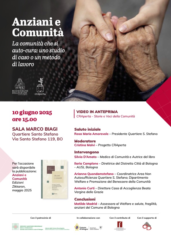 Martedì alle ore 15 nella sala «Marco Biagi» del Quartiere Santo Stefano, al civico 119 della via omonima, si svolgerà la presentazione del volume «Anziani e Comunità. Cra aperta: l’esperienza di una Residenza per Anziani che si apre alle persone fragili della comunità» (Zikkaron Editore), scritto da Silvia D’Amato e con la prefazione del cardinale Matteo Zuppi. L’incontro si aprirà con il saluto di Rosa Maria Amorevole, presidente del Quartiere Santo Stefano, e proseguirà con l’intervento dell’autrice del libro nonché medico di comunità.