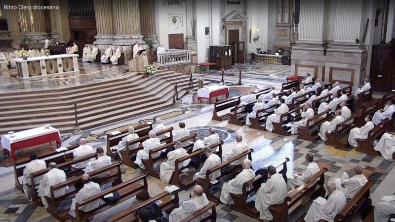 Come ogni anno i presbiteri e i diaconi della diocesi si sono riuniti in Cattedrale per un momento di riflessione concluso con la concelebrazione eucaristica presieduta dall’Arcivescovo, con questo programma: ore 9.45 canto dell’Ora terza; ore 10 riflessione sulla fraternità sacerdotale, guidata da don Davide Baraldi, Vicario Episcopale per il laicato, a partire dalle sintesi dei lavori di gruppo nei Vicariati dello scorso 14 settembre (seconda giornata della Tre Giorni); ore 11.15 concelebrazione eucaristica presieduta dall’Arcivescovo, durante la quale si è pregato per i sacerdoti e diaconi defunti in questo anno.