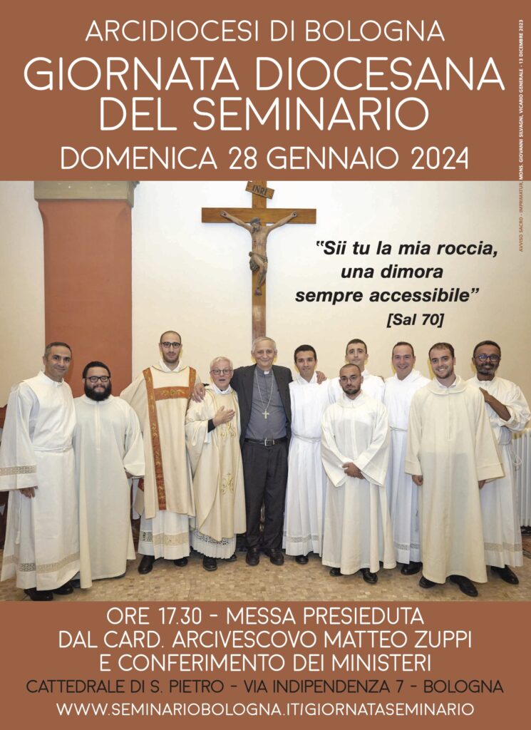 Domenica 28 gennaio alle ore 17.30 in Cattedrale l’Arcivescovo Card. Matteo Zuppi celebrerà la Messa in occasione della Giornata del Seminario che ha come titolo “Sii tu la mia roccia, una dimora sempre accessibile” (Sal 70). Nel corso della liturgia istituirà Accoliti Samiel Melake Micael e fra Giacomo Casarin, della Società San Giovanni. L’Arcivescovo istituirà anche un nuovo Lettore, Samuele Bonora.