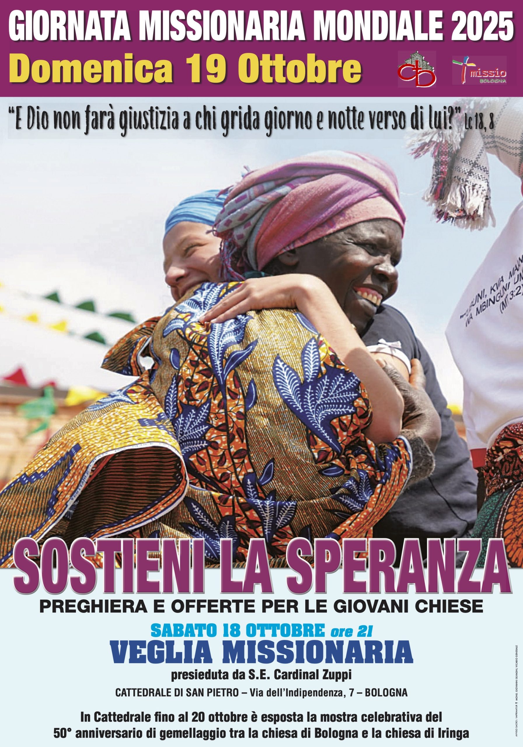 La Giornata è stata celebrata nelle parrocchie domenica 19 ottobre; a livello diocesano il Centro missionario ha proposto la Veglia sabato 18 ottobre alle 21 in Cattedrale, presieduta dall’arcivescovo Matteo Zuppi. Ricordo anche che la solidarietà concreta la manifestiamo con le collette della domenica 24 ottobre, che vanno inviate in Curia attraverso il c/c IT02S0200802513000003103844 intestato ad Arcidiocesi di Bologna e con causale OFFERTA GMM 2025.