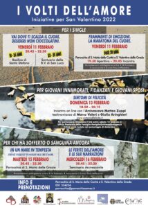 Dopo due anni di pandemia, perché ricordare san Valentino? Eppure proprio in questi due anni abbiamo tutti sperimentato cosa voglia dire essere soli e forse compreso che questa «maratona» purtroppo sarà lunga e solo correndola insieme, abbia- mo una speranza di terminare la corsa. Per questo motivo le iniziative per San Valentino 2022 sono particolarmente importanti e coinvolgeranno differenti realtà del territorio grazie all’impulso di don Davide Baraldi, parroco di Santa Maria della Carità e iniziatore di questi incontri per e con i giovani.