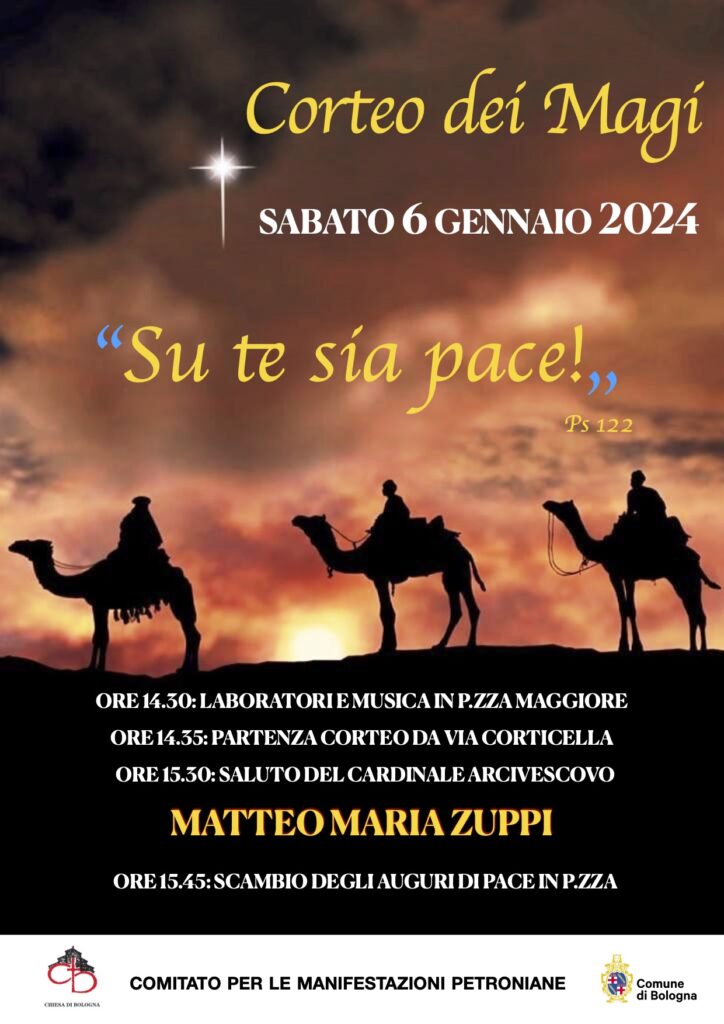 Alle 15.30 in Piazza Maggiore l’Arcivescovo porterà il saluto al Corteo dei Magi, quest’anno dal titolo “Su te sia pace!” organizzato dal Comitato per le Manifestazioni Petroniane. L’evento prevede laboratori e musica in Piazza dalle 14.30 e la partenza del Corteo alle 14.35 da via di Corticella verso il Centro cittadino. Alle 15.45, dopo l’intervento del Card. Zuppi, ci sarà lo scambio degli auguri di pace in Piazza.