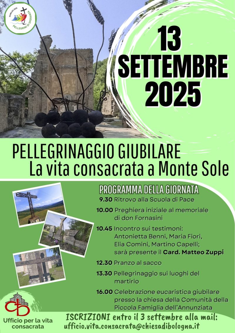 Sabato 13 settembre alle ore 10.00 nel Parco Regionale Storico di Monte Sole in Comune di Marzabotto, presso il Memoriale dedicato al Beato Giovanni Fornasini, l’Arcivescovo Card. Matteo Zuppi guiderà la preghiera iniziale del Pellegrinaggio Giubilare della Vita Consacrata. Alle ore 10.45 interverrà all’incontro su Antonietta Benni, Maria Fiori, Elia Comini e Martino Capelli, testimoni dell’Eccidio di Monte Sole. L’iniziativa è proposta dall’Ufficio diocesano per la Vita Consacrata con l’organizzazione tecnica dell’Agenzia “Petroniana Viaggi”.