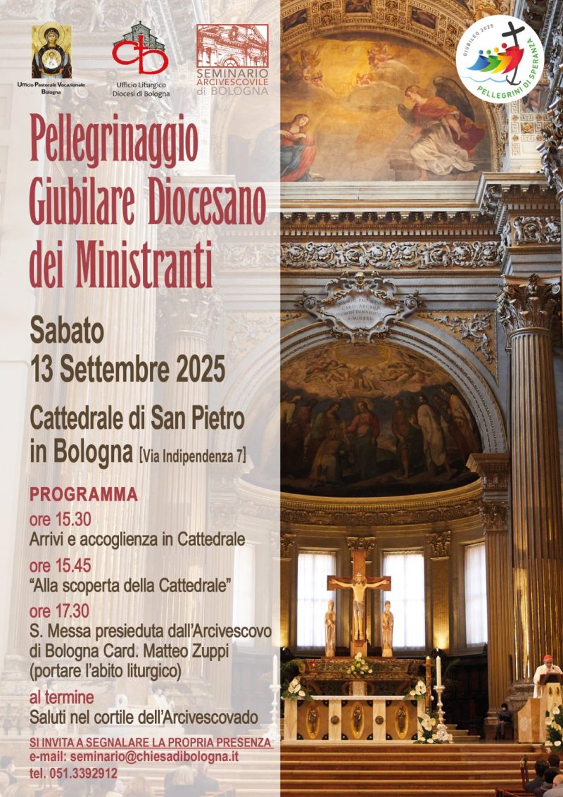 «In occasione dell’Anno Santo – spiegano Mons. Marco Bonfiglioli, Direttore dell’Ufficio diocesano per la Pastorale Vocazionale, e don Stefano Culiersi, Direttore dell’Ufficio Liturgico diocesano – abbiamo pensato di organizzare un Pellegrinaggio Giubilare alla nostra Cattedrale di San Pietro. L’itinerario si svolgerà in tappe che percorreremo dentro la chiesa in modo da diffondere una conoscenza più approfondita della Cattedrale e, con essa, l’importanza del servizio che ciascuno di noi svolge in ogni liturgia».