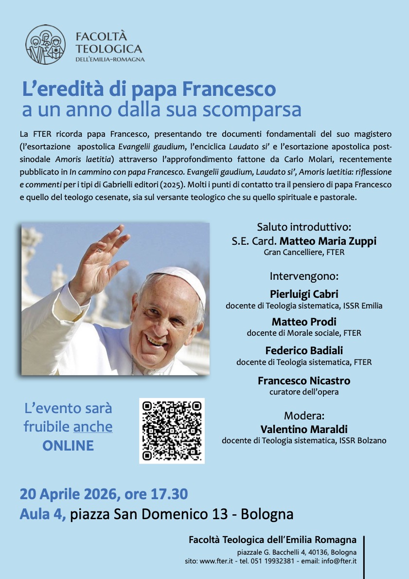 Lunedì 20 alle 17.30 nell’Aula 4 del Convento di San Domenico (Piazza San Domenico, 13) l’Arcivescovo interverrà alla presentazione del volume “In cammino con papa Francesco. Evangelii gaudium, Laudato si’, Amoris laetitia: riflessione e commenti” (Gabrielli Editore), raccolta di scritti del teologo Mons. Carlo Molari curata da Francesco Nicastro. L’evento è proposto dalla Facoltà Teologica dell’Emilia-Romagna in occasione del 1º anniversario della morte di Papa Francesco.