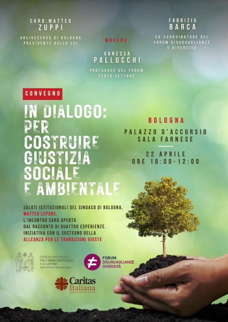 L’appuntamento vedrà che vedrà confrontarsi attorno al tema della transizione ecologica giusta il cardinale Matteo Zuppi, arcivescovo di Bologna e presidente della Cei e Fabrizio Barca, cocoordinatore del Forum Disuguaglianze e Diversità, moderati da Vanessa Pallucchi, portavoce del Forum nazionale del Terzo Settore. Il convegno e organizzato da Forum Disuguaglianze e Diversità, Caritas italiana e Ufficio nazionale per i Problemi sociali e il Lavoro della Conferenza episcopale italiana, con il sostegno dell’Alleanza per le Transizioni Giuste.