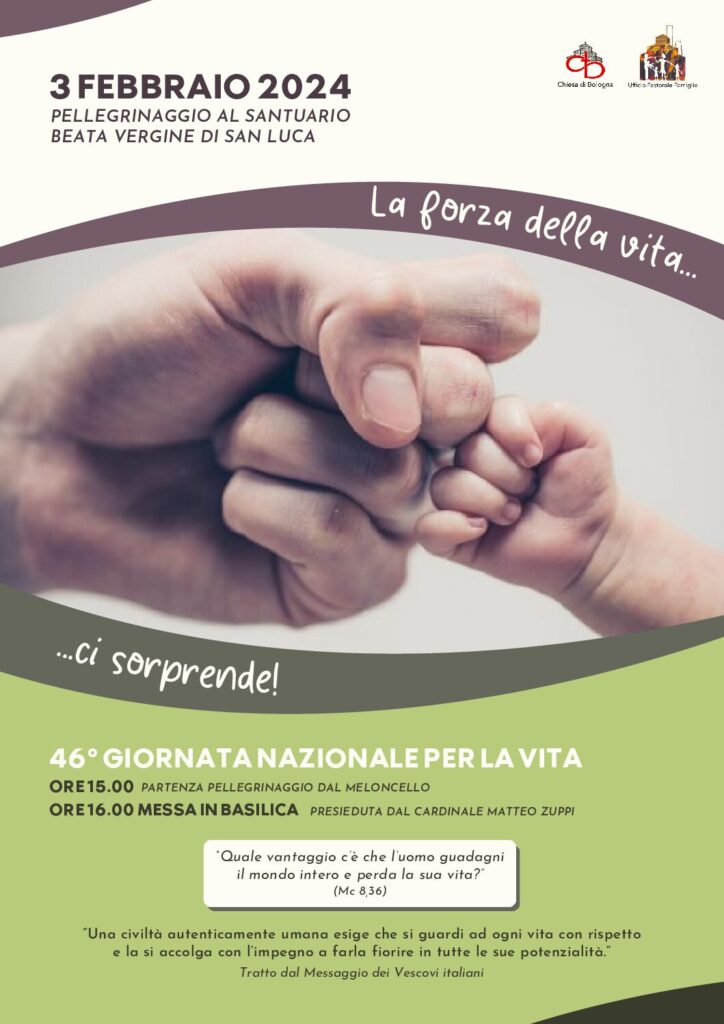 Domenica 4 febbraio si celebra la 46ª Giornata nazionale per la Vita, che quest’anno ha come tema «La forza della vita ci sorprende». Come sempre, in tale occasione il sabato precedente, 3 febbraio, si terrà il pellegrinaggio al santuario della Beata Vergine di San Luca, con recita del Rosario, guidato dall’arcivescovo Matteo Zuppi. Alle 15 partenza dal Meloncello, alle 16 Messa del cardinale in Basilica.
