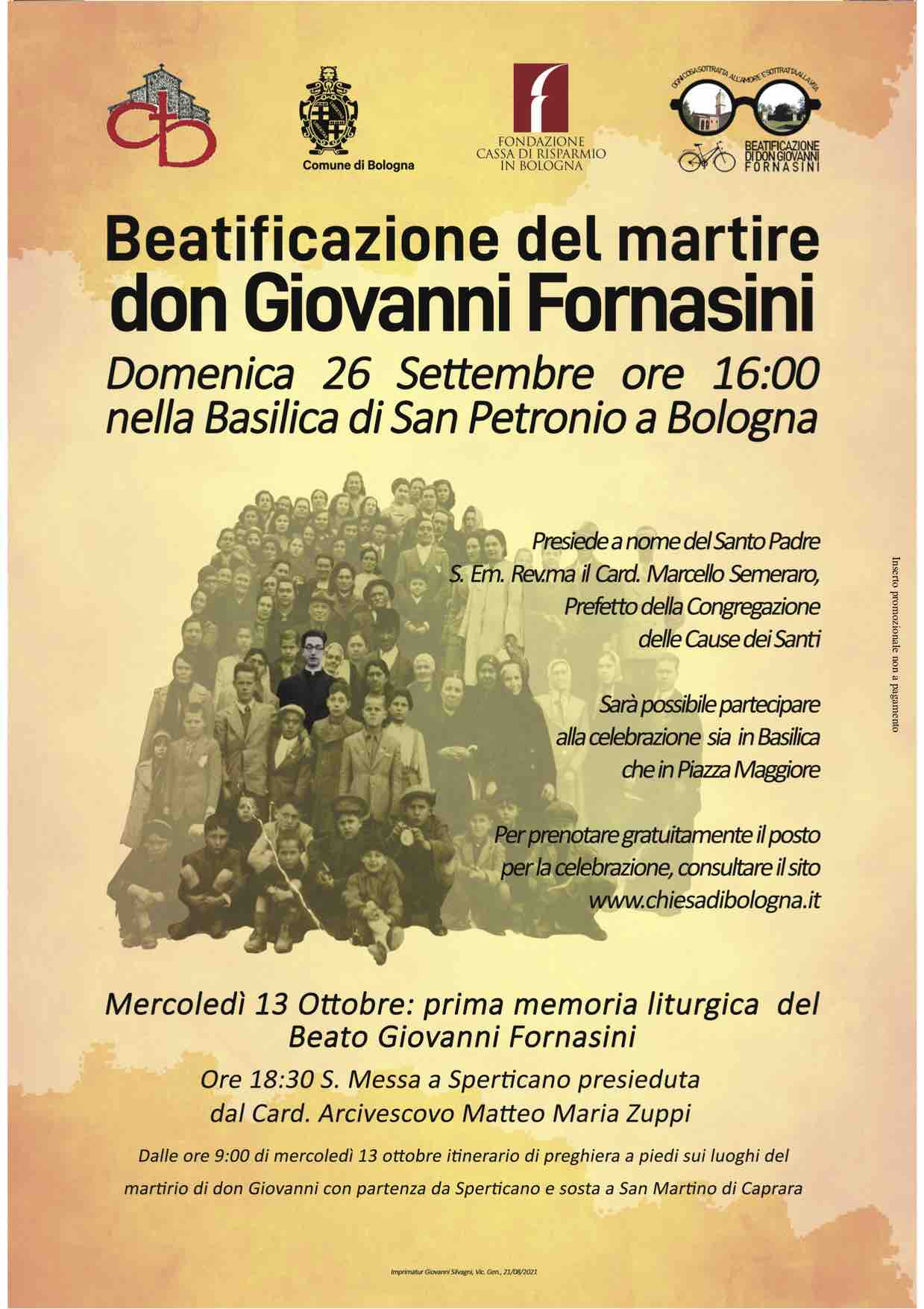 Domenica 26 settembre 2021 alle ore 16.00 nella Basilica di San Petronio in Bologna si celebra la Messa di Beatificazione del martire don Giovanni Fornasini, morto il 13 ottobre 1944 a San Martino di Caprara, testimone degli eccidi avvenuti a Monte Sole nei giorni precedenti.