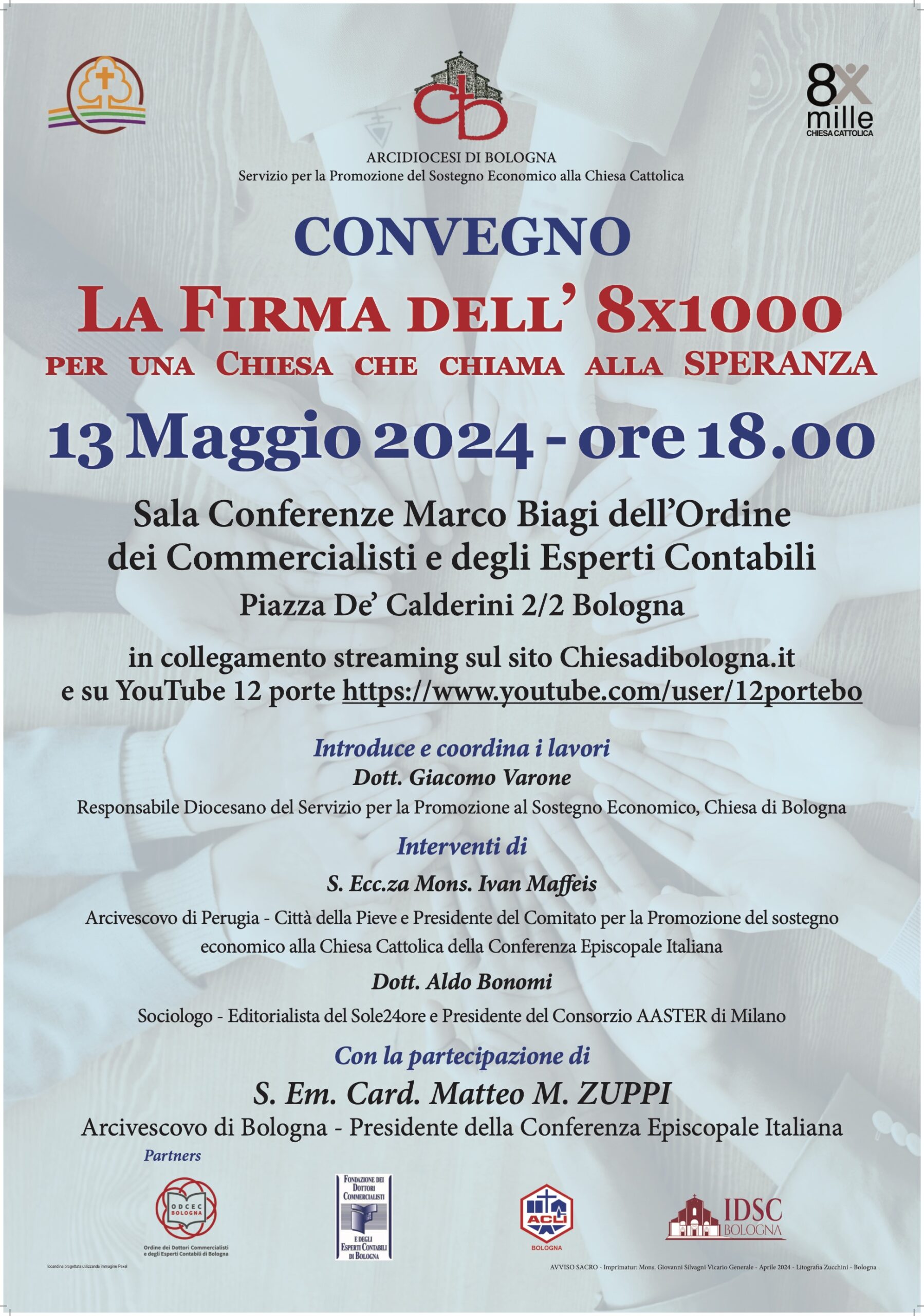 Lunedì 13 maggio alle 18, nella Sala Marco Biagi, nella sede dell’Ordine dei Commercialisti e degli Esperti Contabili, (Piazza de’ Calderini 2/2) si terrà il convegno «La Firma dell’8×1000 – Per una Chiesa che chiama alla speranza».