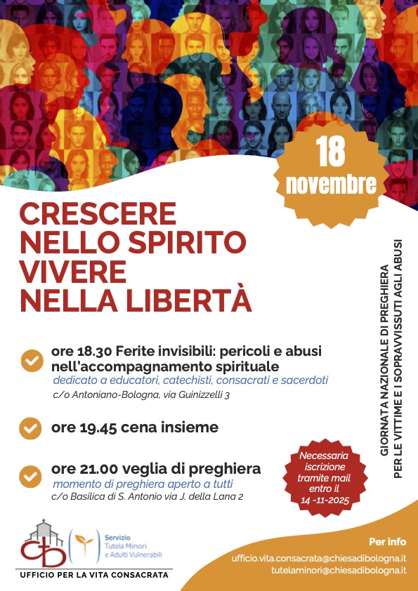 A livello diocesano, un appuntamento, dedicato a educatori, catechisti, consacrati e sacerdoti, in collaborazione con l’Ufficio diocesano per la Vita consacrata, si terrà proprio il 18 novembre alle 18.30 all’Antoniano (via Guinizelli, 3). Una riflessione comune sarà seguita, alle 19.45, dalla cena insieme e, alle 21, da una Veglia di preghiera nell’attigua chiesa di Sant’Antonio di Padova guidata da don Angelo Baldassarri, vicario generale per la Sinodalità. Il titolo della giornata è: «Crescere nello spirito, vivere nella libertà». Per partecipare occorre prenotarsi entro il 14 novembre, scrivendo a: ufficio.vita.consacrata@chiesadibologna.it oppure a tutelaminori@chiesadibologna.it