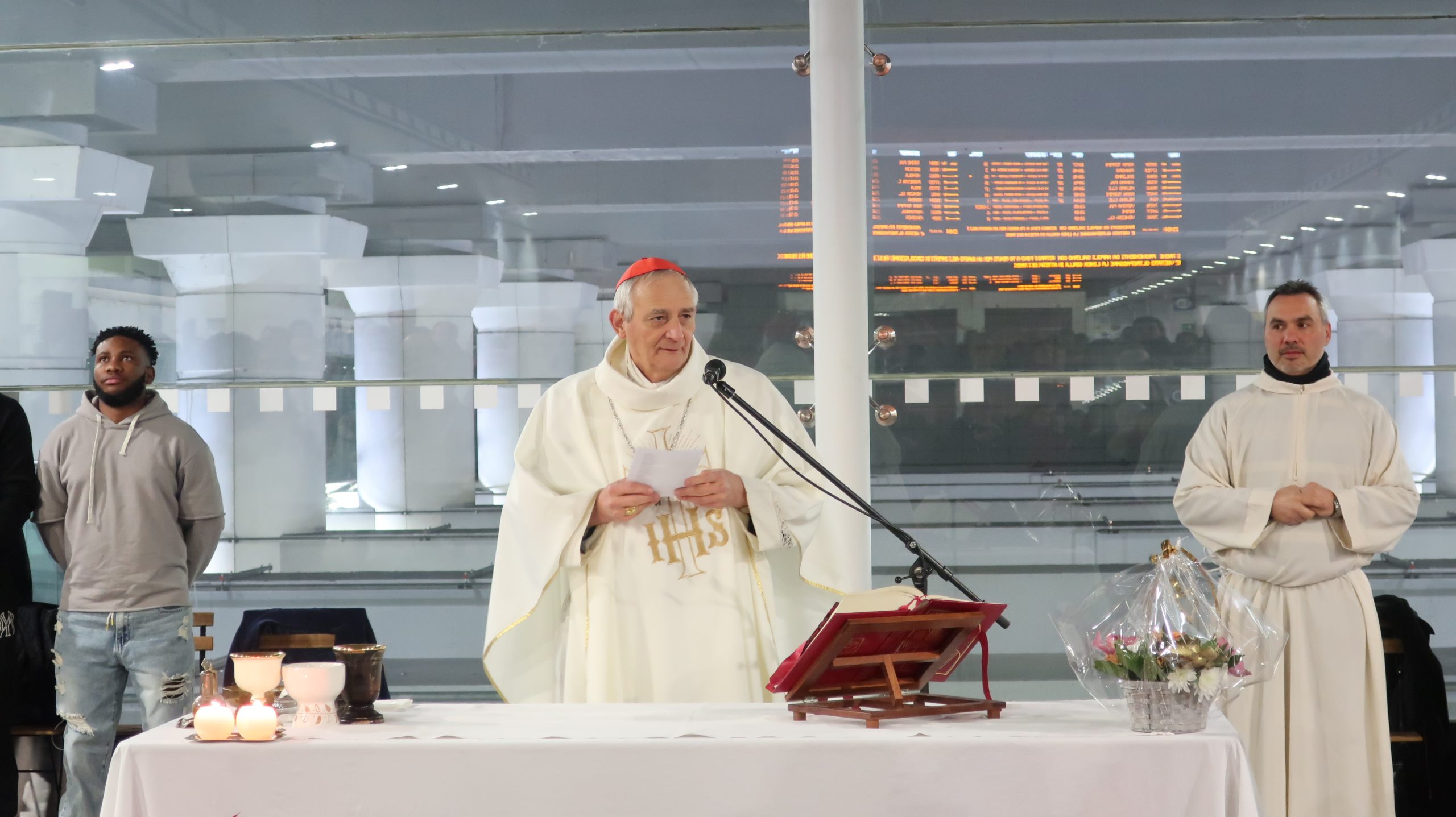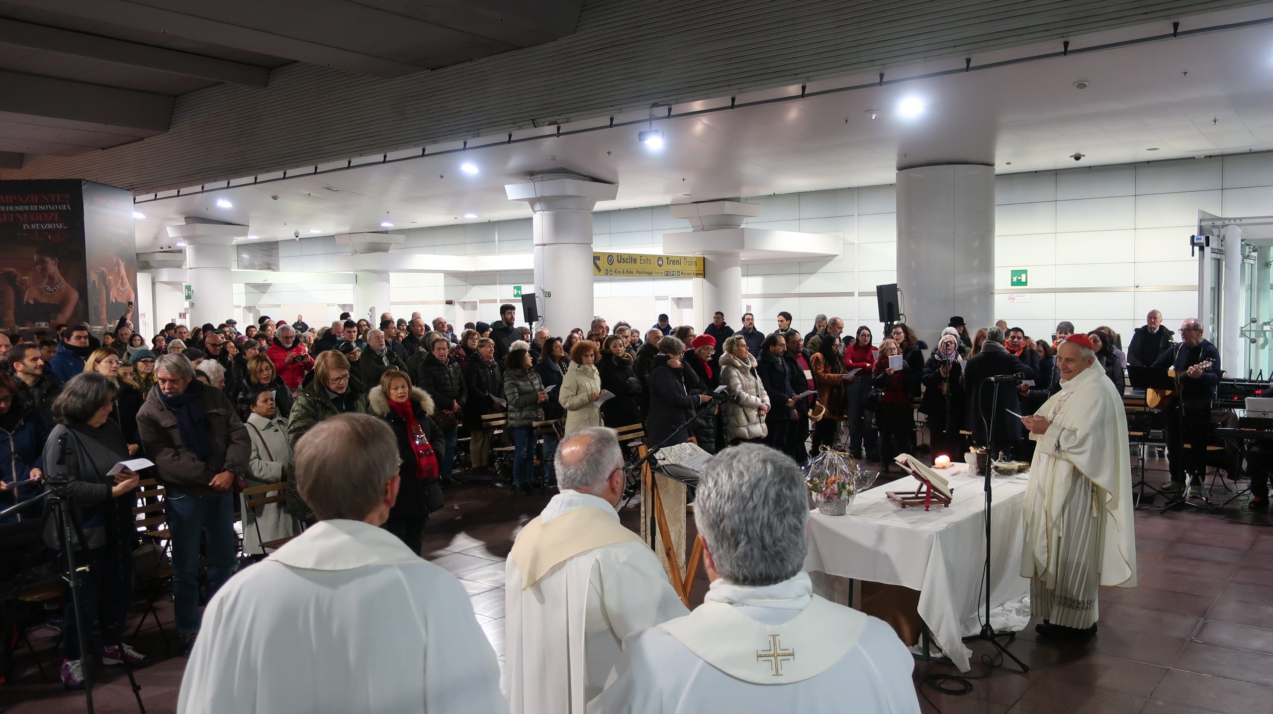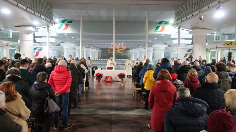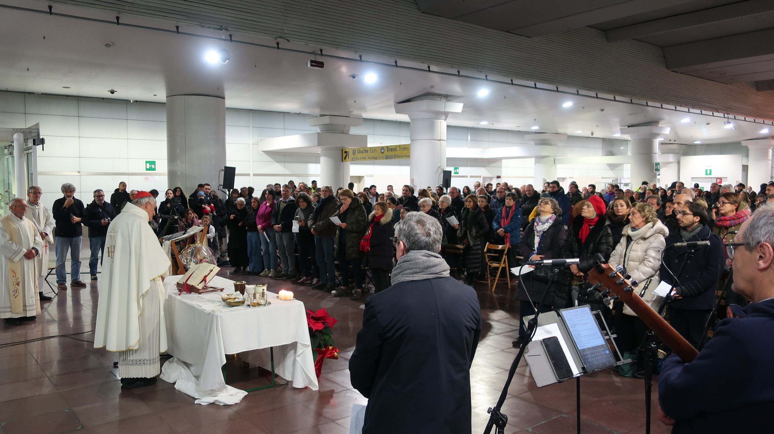 Un preludio singolare delle celebrazioni natalizie ha avuto luogo anche quest’anno nella Hall Alta velocità della Stazione di Bologna Centrale dove l’Arcivescovo ha celebrato la Messa vigiliare. I sociologi chiamano posti come questi i “non-luoghi”, spazi non connotati, neutrali, luoghi di transito di passaggio, dove si sta in tanti e spesso anche molto vicini, ma allo stesso tempo distanti uno dall’altro, luoghi che sono così espressivi del nostro modo di vivere nei quali spesso si concentrano le contraddizioni della vita: qui transitano lavoratori, turisti, professionisti, ma anche le tante miserie e fragilità che sono presenti nella vita delle nostre città. La Messa alla stazione era stata proposta da Comunità di Sant’Egidio, Albero di Cirene, Comunità di Villaregia, Caritas diocesana, Centro Astalli, Cooperativa Sociale DoMani e altre realtà. Era presente anche il nuovo parroco di San Benedetto, don Stefano Culiersi nel cui territorio si trova la stazione ferroviaria.