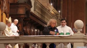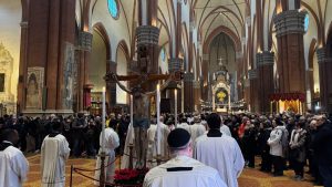All’ingresso della Basilica di San Petronio è stato collocato il Crocifisso del Beato Bartolomeo Maria Dal Monte che per tutto l’anno giubilare è stato venerato in Cattedrale accanto al Battistero.