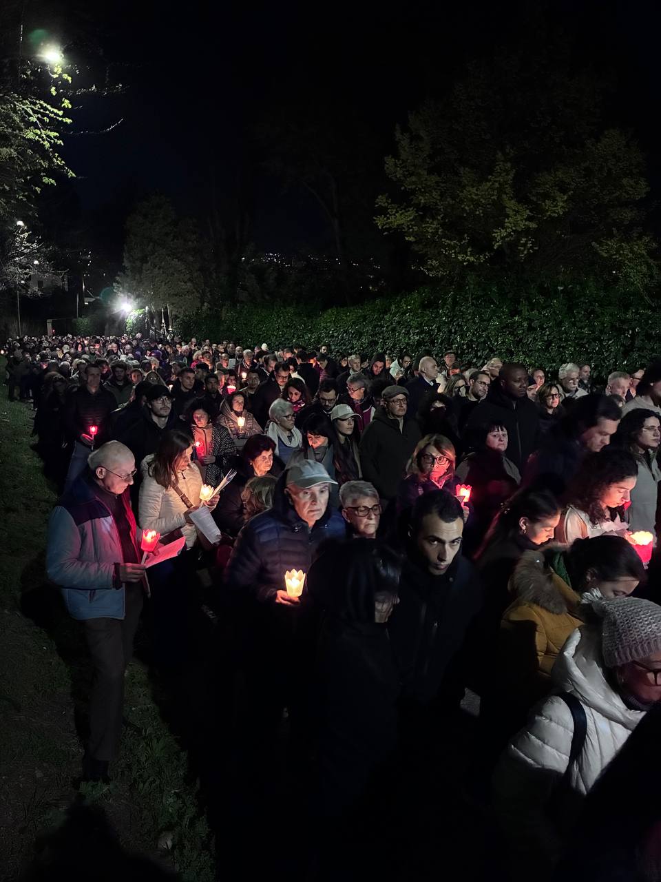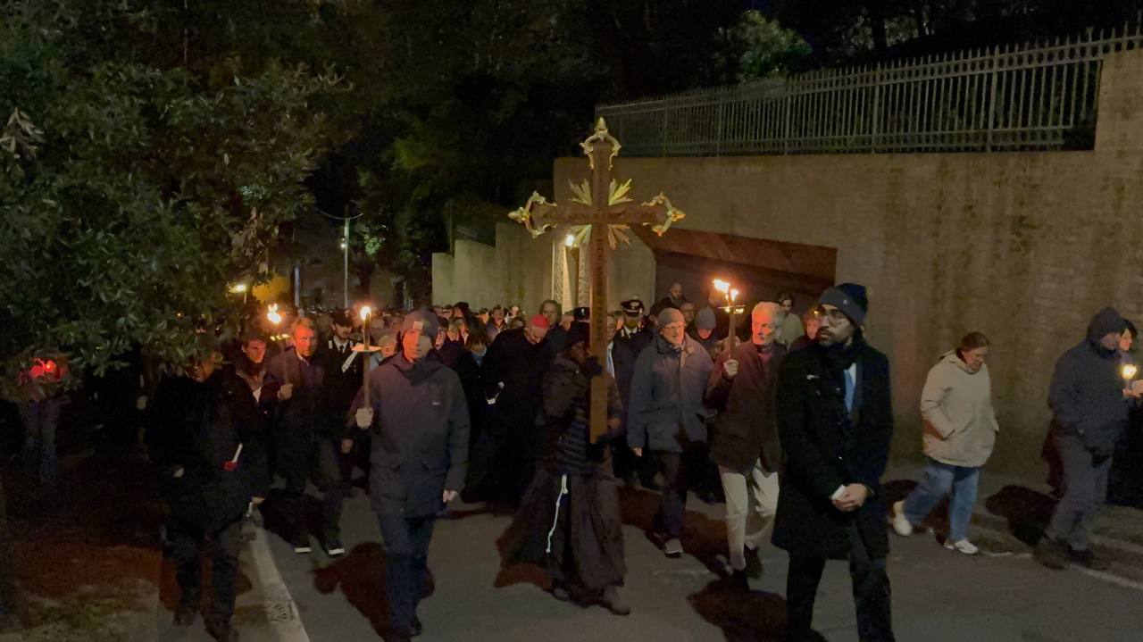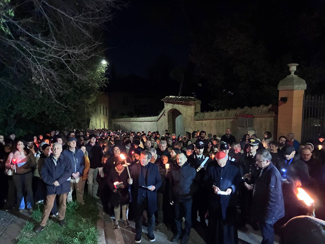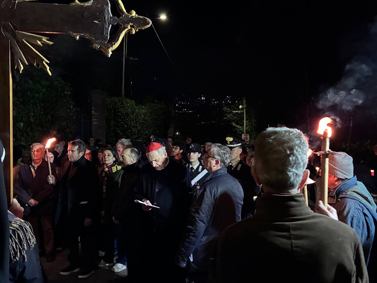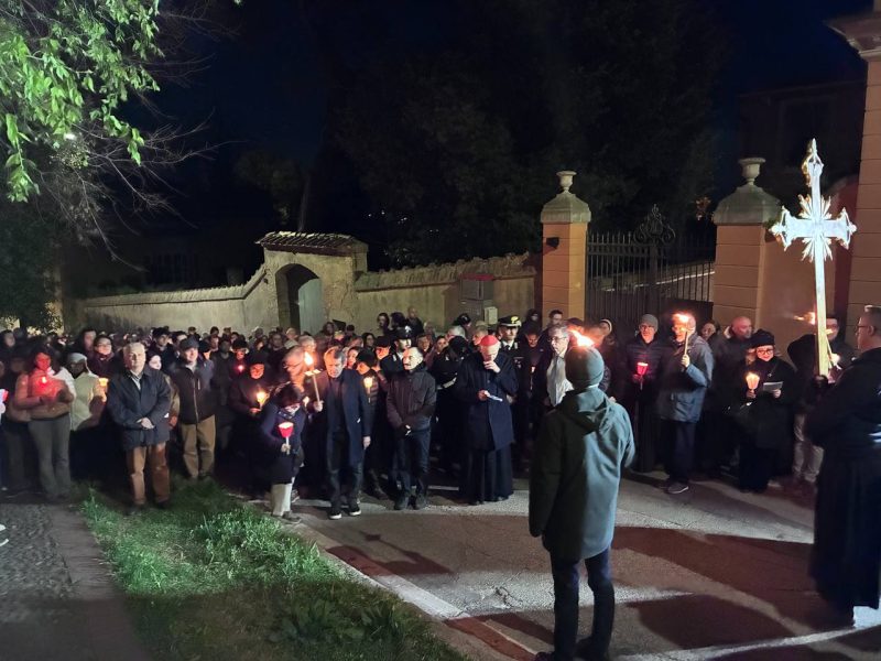 «Questo Venerdì Santo – si legge nel testo di introduzione alla Via Crucis – giunge a noi in un tempo segnato da guerre e violenze, da preoccupazioni angoscianti che crescono piuttosto che placarsi. Ci vuole svegliare da una superficialità che si abitua a tutto e da una indifferenza che non pone alcun freno al continuo scivolamento verso il baratro. Ripercorrere la passione di Gesù interroghi il nostro spirito, risvegli la nostra umanità e la nostra esile fede, faccia germogliare una preghiera sincera e un silenzio generante forza».