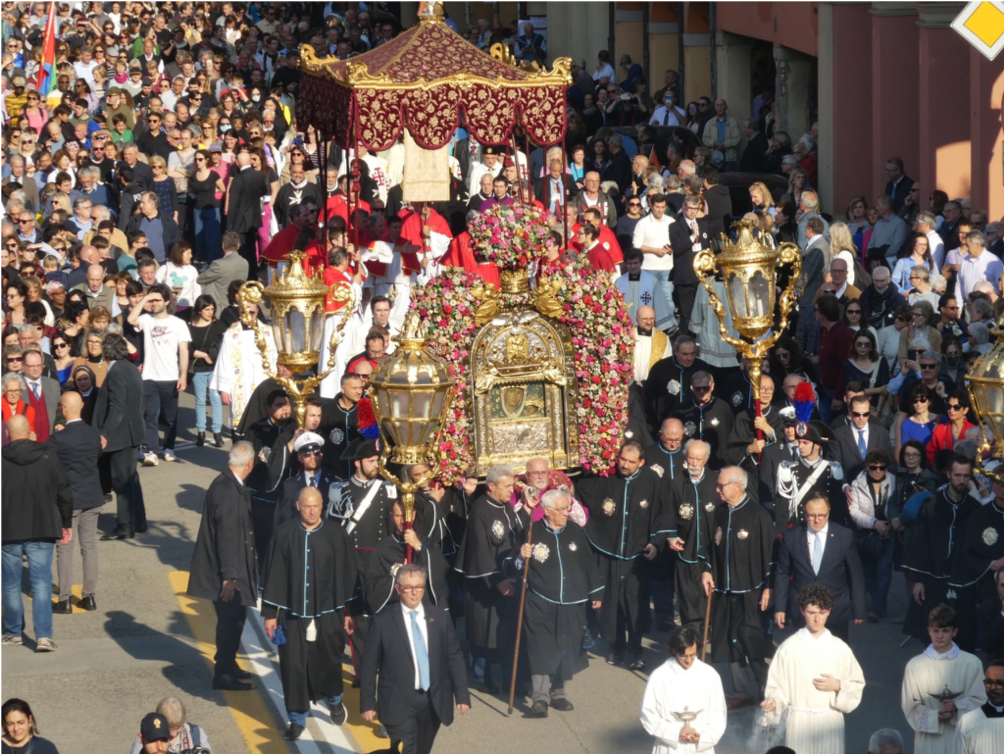 L’icona della Madonna di San Luca arriva in città verso la fine del XIII secolo. Sono questi gli anni che vedono la nascita del Santuario della Beata Vergine di San Luca a Bologna. Trasportata da un pio pellegrino, in seguito l’immagine viene affidata dai maggiorenti della città ad alcune monache di un convento sul Colle della Guardia che, nel tempo, si sono preoccupate di adornarla con fiori e gioielli. Punto di convergenza della devozione popolare, l’icona raffigura una Madonna con il Bambino secondo la classica iconografia orientale di tipo odigitria anche in virtù di intensi contatti tra le correnti orientali e occidentali.