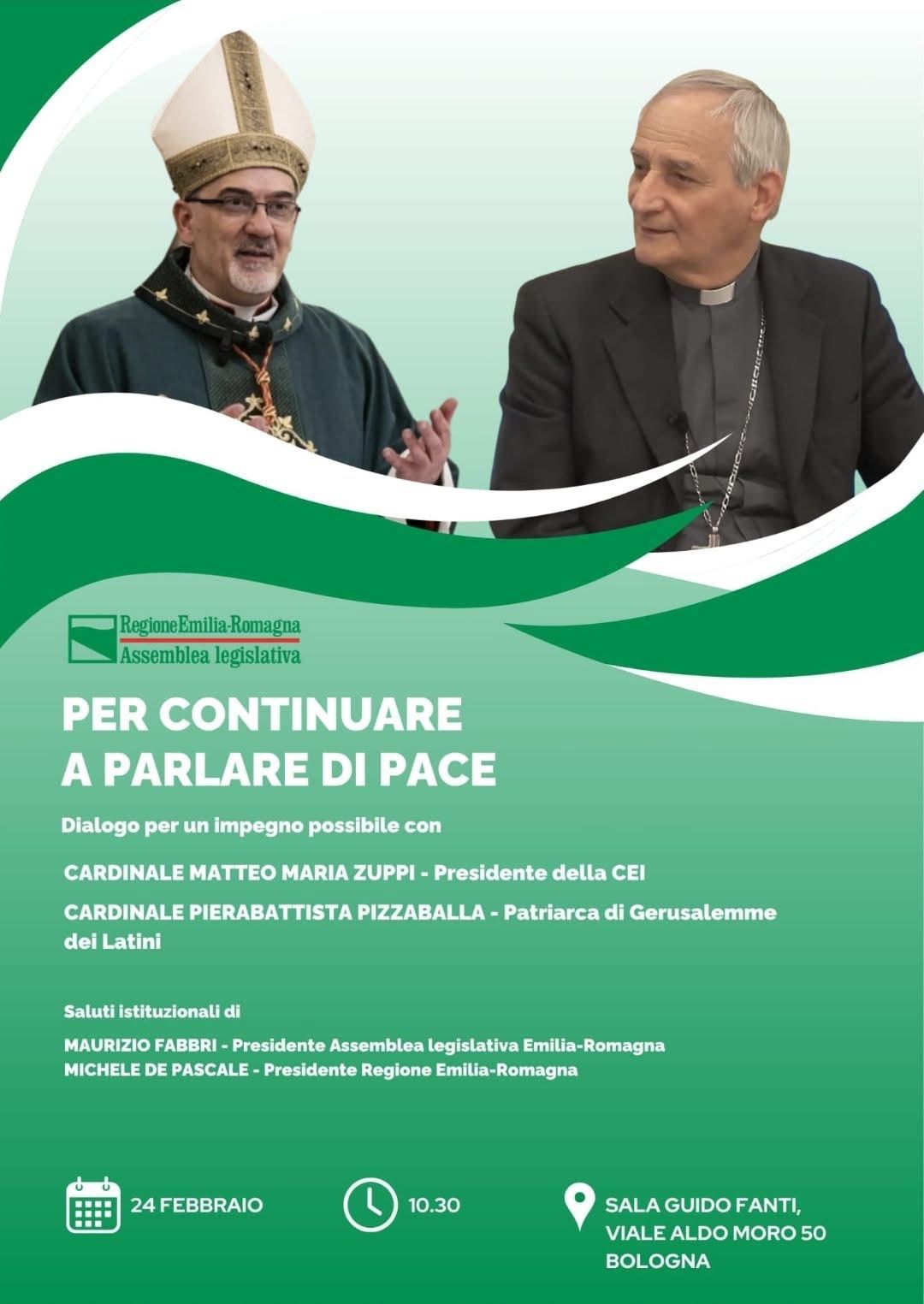 Martedì 24 febbraio alle 10.30 nella Sala “Guido Fanti” dell’Assemblea Legislativa della Regione Emilia-Romagna (viale Aldo Moro, 50) l’Arcivescovo dialogherà con il Card. Pierbattista Pizzaballa, Patriarca di Gerusalemme dei Latini, su “Per continuare a parlare di pace”. L’incontro sarà aperto dai saluti istituzionali di Michele De Pascale, Presidente della Regione Emilia-Romagna, e da Maurizio Fabbri, Presidente dell’Assemblea Legislativa.
