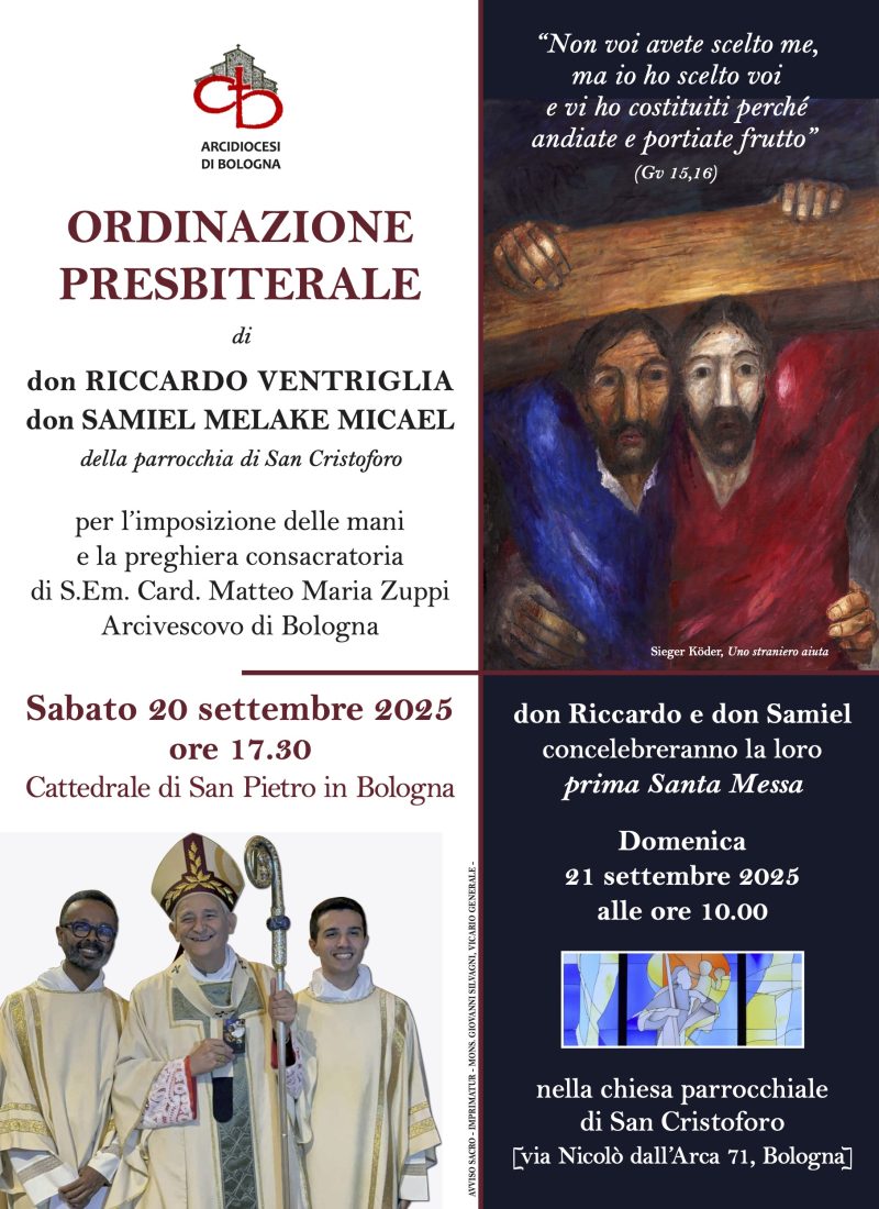 Sabato 20 settembre  in Cattedrale il Cardinale Arcivescovo ha celebrato la Messa con le ordinazioni presbiterali di don Samiel Melake Micael e don Riccardo Ventriglia. La celebrazione è stata trasmessa anche in diretta streaming su questo sito e sul canale YouTube di «12Porte».