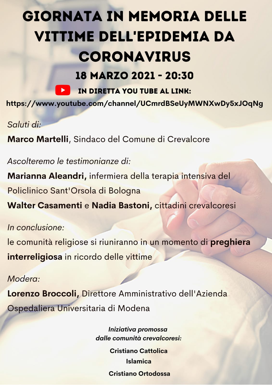CREVALCORE – Per la giornata nazionale per le vittime del covid, il comune di Crevalcore, insieme alle comunità religiose cattolica, islamica e ortodossa, ha organizzato un evento di riflessione e preghiera.