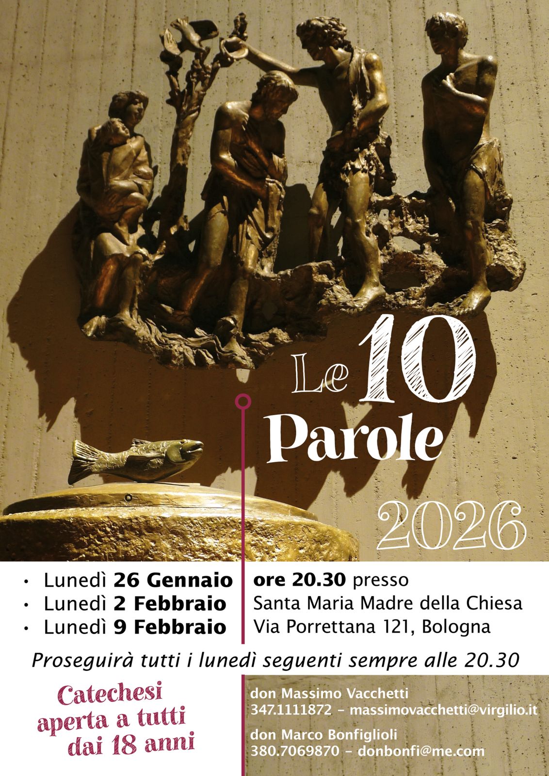 L’iniziativa «Le 10 Parole» edizione 2026 avrà inizio con tre serate introduttive previste nei lunedì 26 gennaio, 2 e 9 febbraio, per poi proseguire tutti i lunedì successivi, sempre alle 20.30, nella parrocchia di Santa Maria Madre della Chiesa a Bologna, via Porrettana, 121.