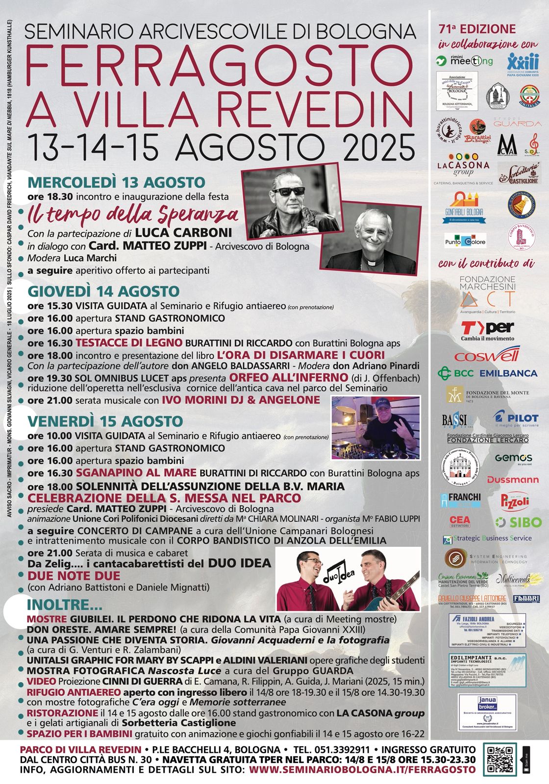 «Ferragosto a Villa Revedin – afferma monsignor Marco Bonfiglioli, rettore del Seminario – nacque dall’intuizione del cardinale Giacomo Lercaro per offrire ai Bolognesi che restano in città un luogo di ristoro e un’offerta culturale, di festa e formazione. Anche quest’anno l’invito dell’arcivescovo Matteo Zuppi si estende a tutti i cittadini, vecchi e nuovi, per vari momenti di condivisione e per la Messa nel giorno dell’Assunta nel parco del Seminario. L’edizione 2025 si aprirà con il dialogo tra il nostro Cardinale e il cantautore Luca Carboni sul tema della speranza che sarà il filo conduttore di questa edizione, collegandosi al tema del Giubileo che stiamo vivendo. Inoltre ricorderemo anche l’80º anniversario dalla fine della Seconda Guerra mondiale, domandando che, al più presto, possa arrivare la pace anche in Ucraina e in Terra Santa oltre che in tutti gli altri scenari di guerra. Nei giorni della manifestazione non mancheranno spazi e attività per i più piccoli affinché tutti, in questi giorni di festa, si sentano a casa».