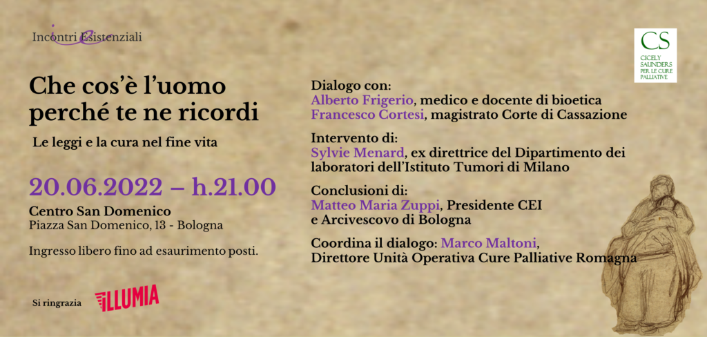 Si intitola «Che cos’è l’uomo perché te ne ricordi? Le leggi e la cura nel fine vita» l’incontro proposto da «Incontri esistenziali» e cheti svolgerà lunedì 20 giugno dalle ore 21 nel Salone Bolognini del Convento di San Domenico. All’incontro parteciperà anche il cardinale Matteo Zuppi insieme a medici, docenti e un magistrato.