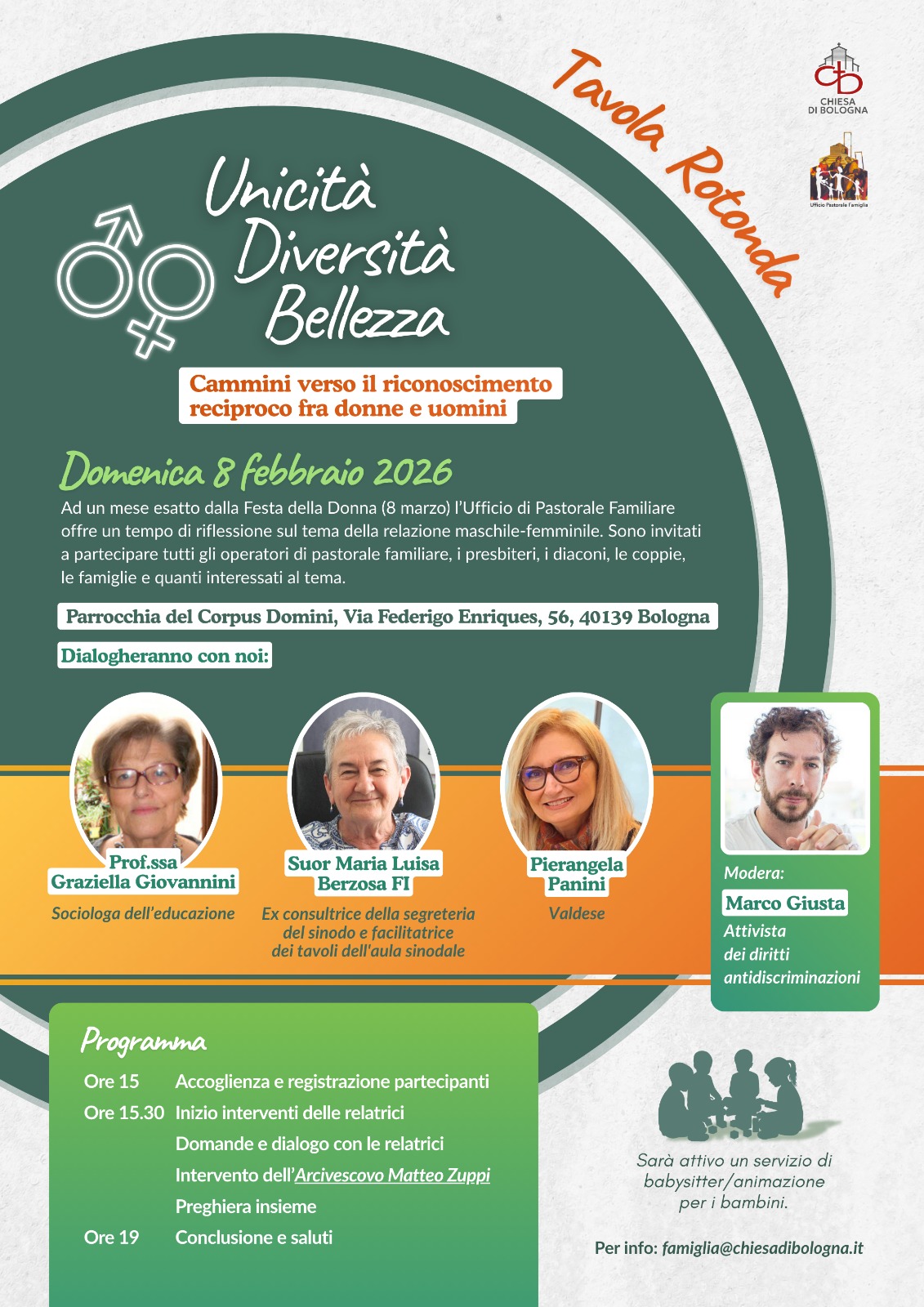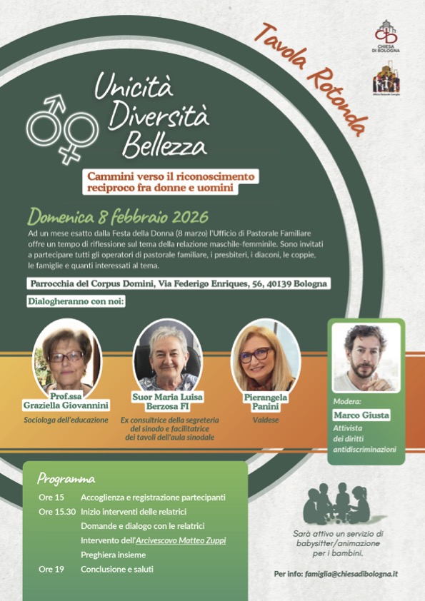Alla tavola rotonda, che avrà come tema: «Unicità, Diversità, Bellezza. Cammini verso il riconoscimento reciproco fra donne e uomini» interverranno tre donne: Graziella Giovannini sociologa, che guiderà i presenti in un percorso storico sull’evoluzione dei diritti delle donne; suor Maria Luisa Berzosa, delle Figlie di Gesù, presenterà una lettura del ruolo della donna nella Chiesa e di come sta cambiando; Pierangela Panini, biblista della Chiesa valdese, approfondirà il ruolo femminile nelle Scritture. Coordinerà gli interventi, mettendo in dialogo le tre voci, Marco Giusta, esperto di diritti. Le conclusioni saranno tratte, alle 18, dall’arcivescovo Matteo Zuppi. Si concluderà con la preghiera. Sarà attivo un servizio di babysitter/animazione per i bambini. Per info: famiglia@chiesadibologna.it