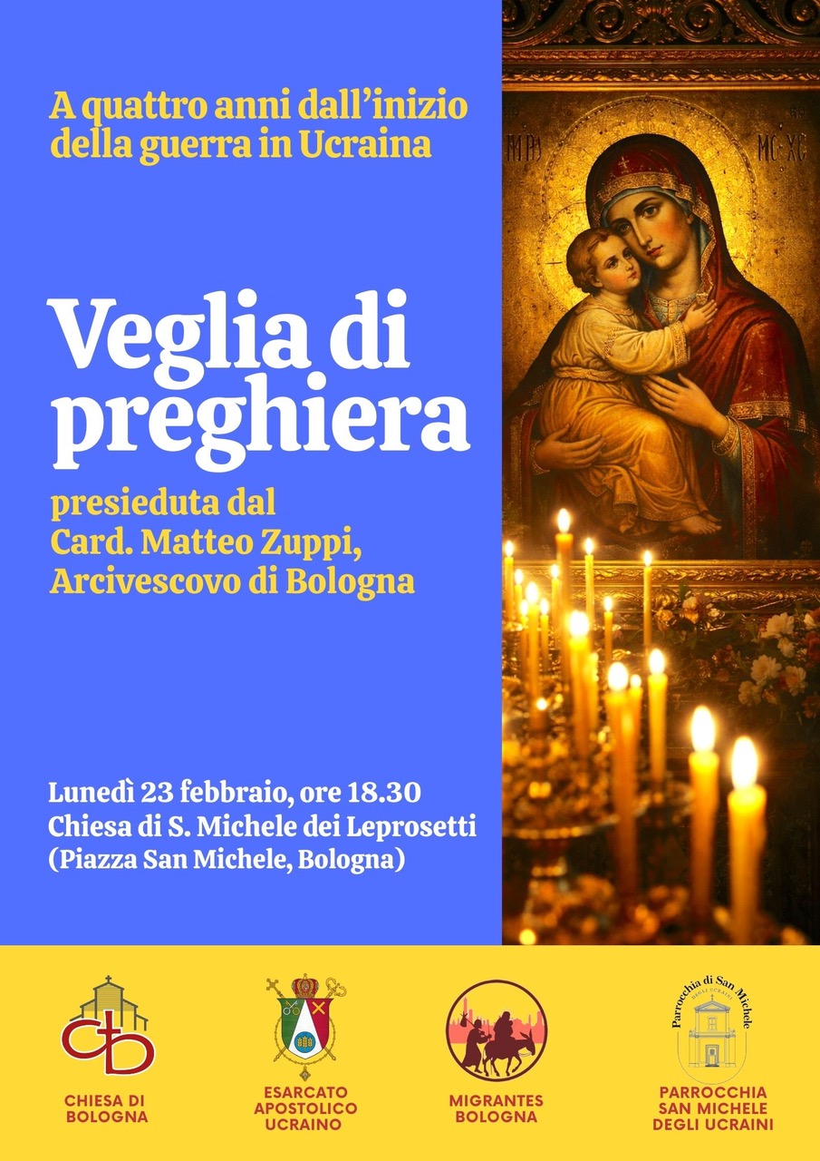 A quattro anni dall’inizio dell’invasione russa dell’Ucraina, il Cardinale Zuppi presiederà lunedì 23 febbraio alle 18.30. una veglia di preghiera nella parrocchia ucraina di San Michele dei Leprosetti (Piazza San Michele).