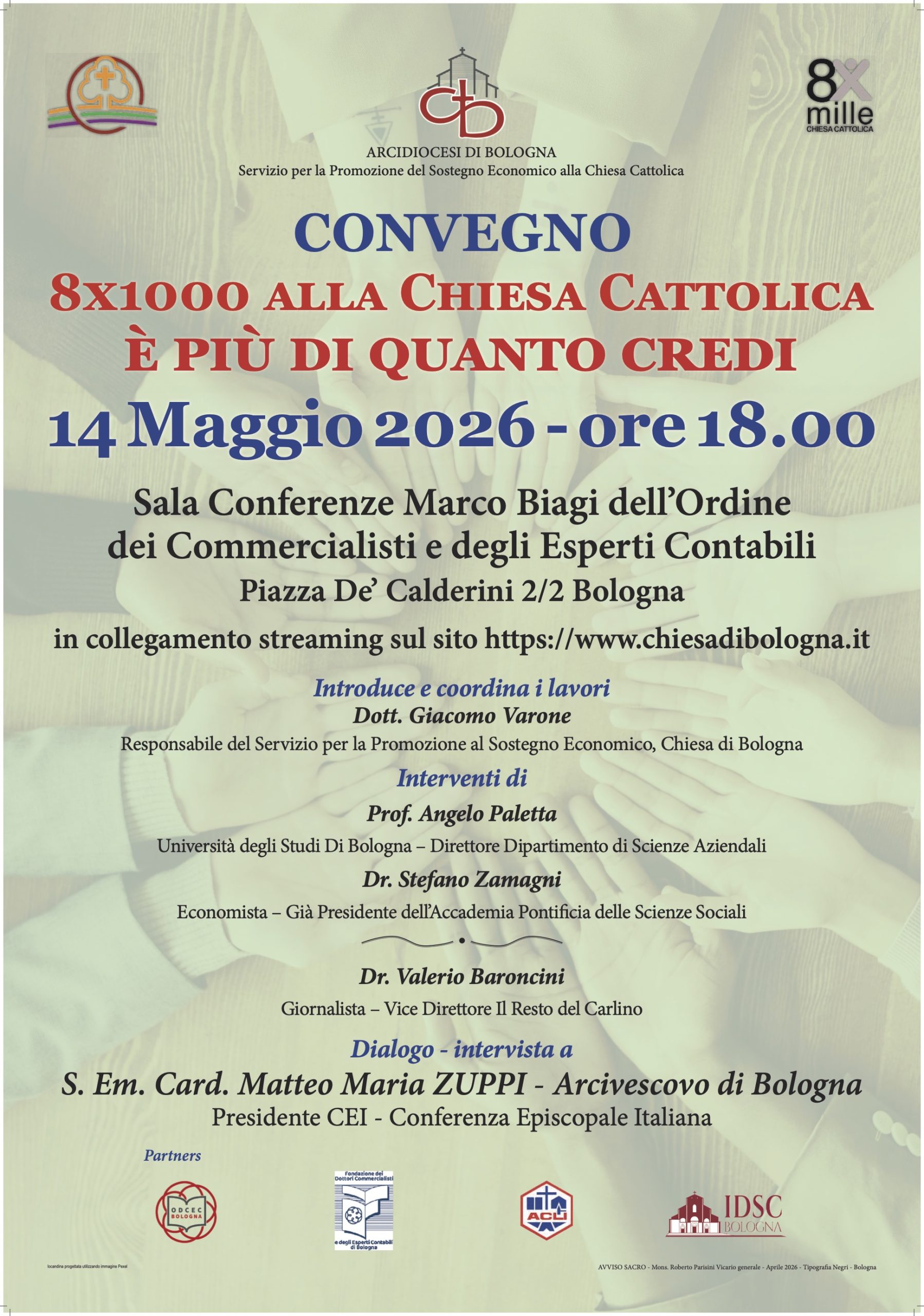 Giovedì 14 maggio alle 18 nella Sala Conferenze “Marco Biagi” dell’Ordine dei Commercialisti e degli Esperti Contabili (piazza de’ Calderini, 2/2) l’Arcivescovo Card. Matteo Zuppi interverrà al convegno “8×1000 alla Chiesa Cattolica. È più di quanto credi”, proposto dal Servizio diocesano per la Promozione al Sostegno Economico alla Chiesa Cattolica “Sovvenire”.