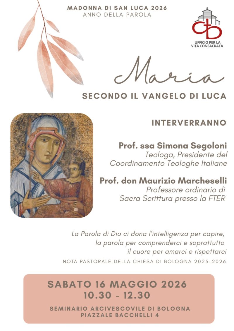 Sabato 16 maggio alle ore 10.30 nell’Aula Magna del Seminario si svolgerà l’incontro “Maria secondo il Vangelo di Luca” con interventi di Simona Segoloni, teologa e Presidente del Coordinamento teologhe italiane, e don Maurizio Marcheselli, docente di Sacra Scrittura alla Facoltà Teologica dell’Emilia-Romagna.
