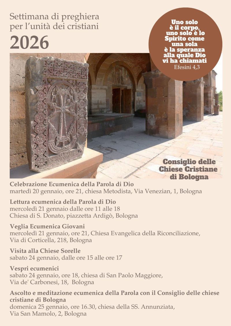Da martedì 20 a domenica 25 gennaio si svolgerà la Settimana di preghiera per l’Unità dei Cristiani 2026 con la Celebrazione ecumenica della Parola di Dio, Lettura ecumenica della Parola di Dio, Veglia ecumenica per i giovani, visita alle Chiese sorelle, Vespri ecumenici, ascolto e meditazione ecumenica della Parola con il Consiglio delle Chiese cristiane a Bologna.