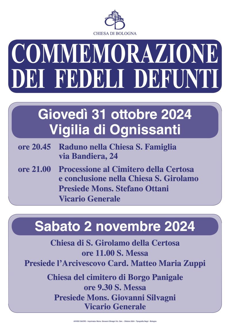 Eventi 31 Ottobre 2024 giovedì 31 Ottobre 20:45 Commemorazione dei fedeli defuntiInizio: 31/10/2024 20:45