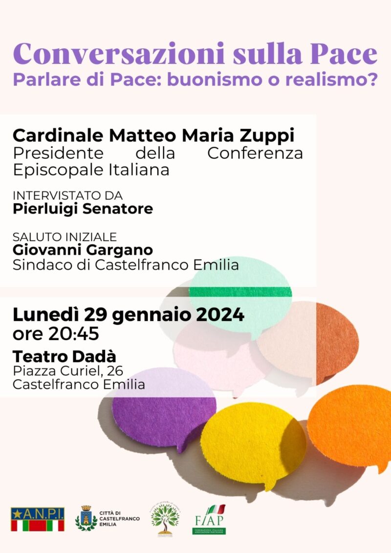 Eventi, Zuppi 24 Gennaio 2024 lunedì 29 Gennaio 20:45 Incontro su «Conversazioni sulla pace. Parlare di pace: buonismo o realismo?»Inizio: 29/01/2024 20:45