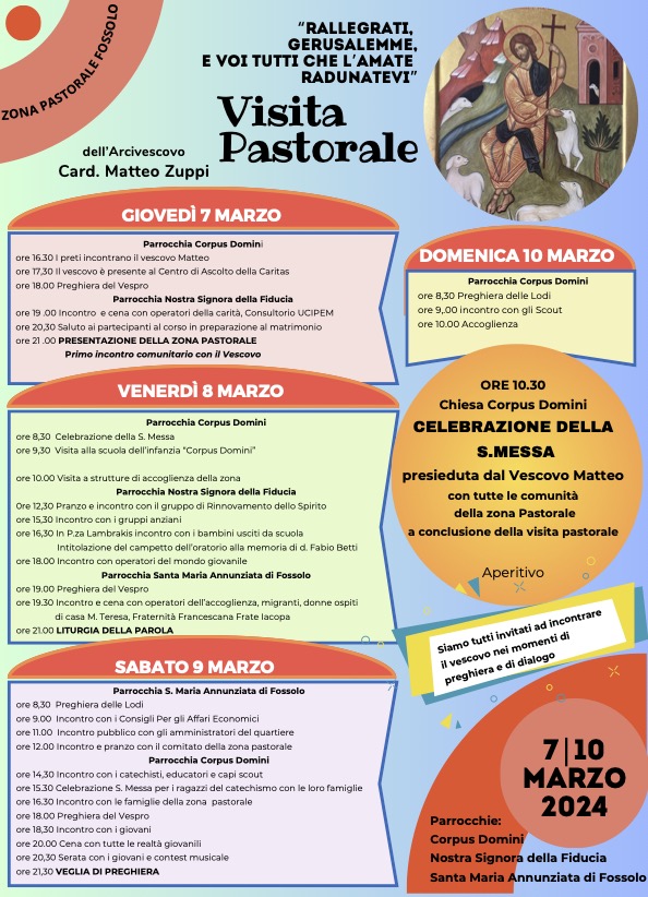 Eventi, Zuppi 28 Febbraio 2024 giovedì 7 Marzo 16:30 Visita pastorale alla Zona FossoloInizio: 07/03/2024 16:30